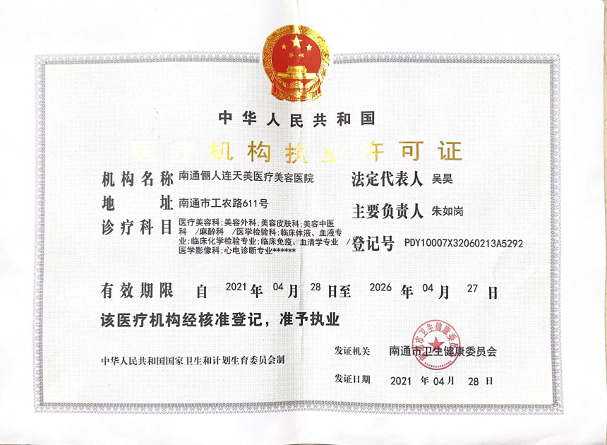 南通儷人連天美醫(yī)療美容醫(yī)院是與著名的醫(yī)療美容集團合作建立的醫(yī)院,醫(yī)院提供高品質的醫(yī)療美容服務。2008年,南通儷人連天美醫(yī)療美容醫(yī)院落戶南通,成為由南通衛(wèi)生局審批的專業(yè)醫(yī)療美容醫(yī)院。南通儷人連天美醫(yī)療美容醫(yī)院,特別設有專業(yè)的整形美容科、皮膚美容科和微創(chuàng)美容科三大科室,致力于為廣大求美者提供全方位的醫(yī)療美容服務。南通儷人連天美醫(yī)療美容醫(yī)院為求美者建立個人終生美麗檔案,一對一進行細致服務。 11年來,南通儷人連天美醫(yī)療美容醫(yī)院,不斷引進先進設備,不斷完善醫(yī)美技術,一批優(yōu)秀、專業(yè)而穩(wěn)定的醫(yī)生團隊,為無數(shù)求美者鑄就美麗夢想。